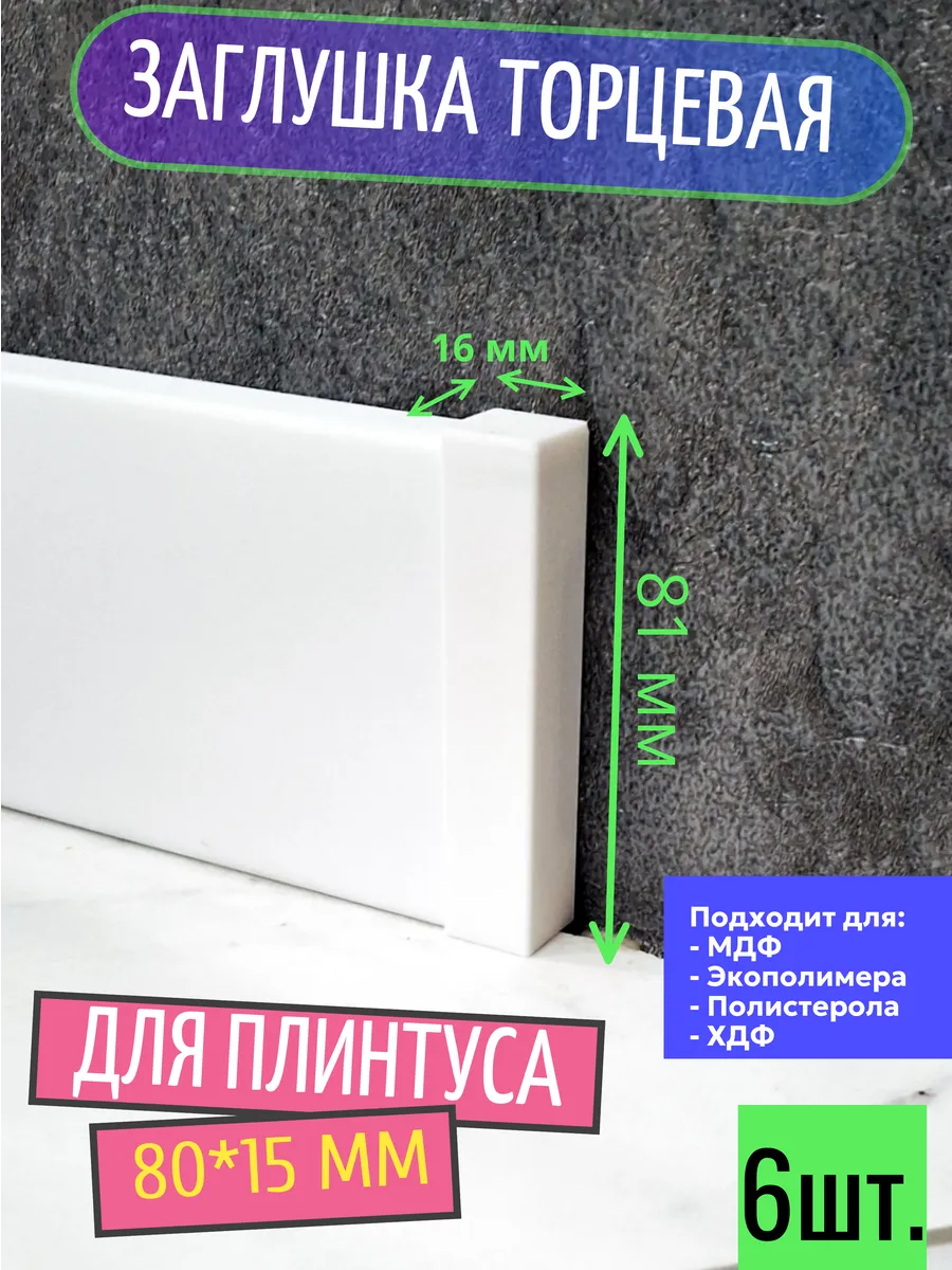 Заглушка отлично подходит для плинтусов из различных материалов, таких как МДФ, экополимер и полистирол, а также для любых других, имеющих прямоугольный профиль. Универсальный дизайн и продуманные размеры (80*16 мм) гарантируют идеальную посадку на торец плинтуса с профилем 80x15 мм, обеспечивая его защиту и эстетическую завершенность.