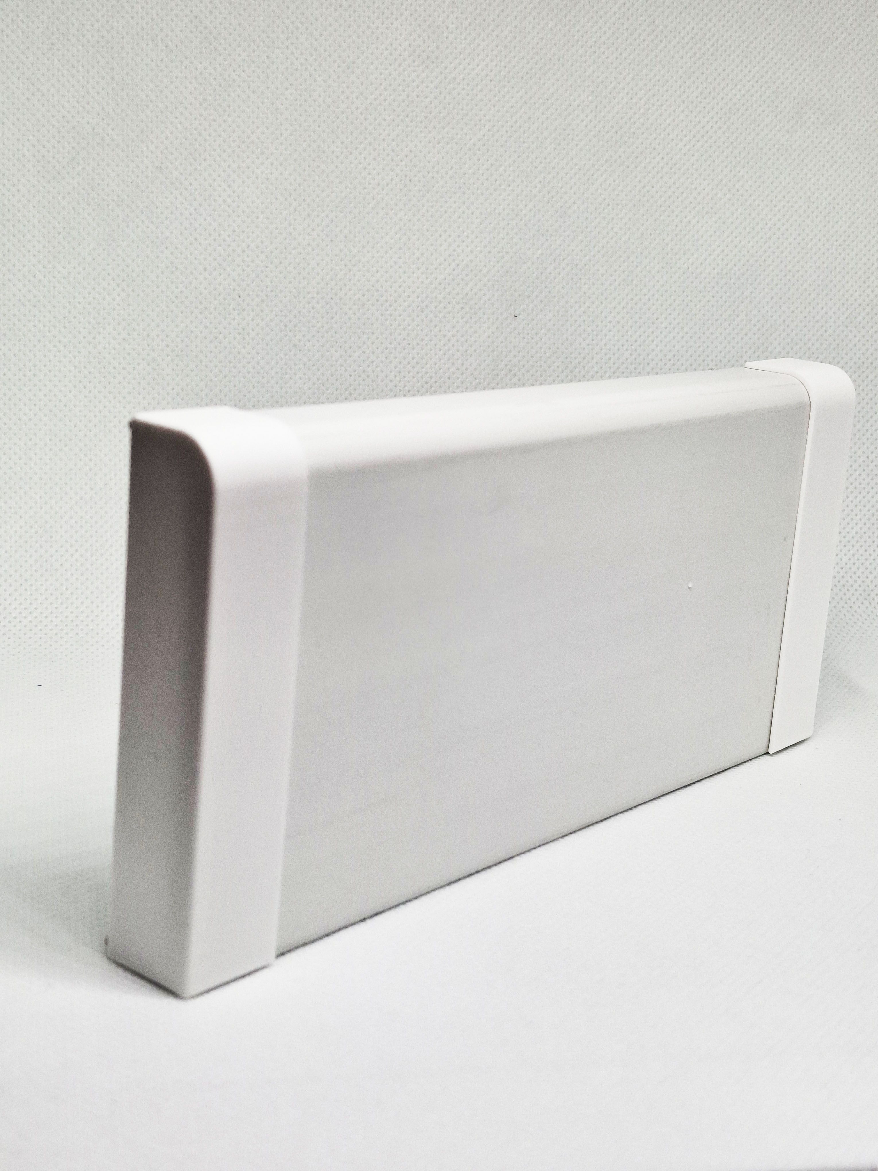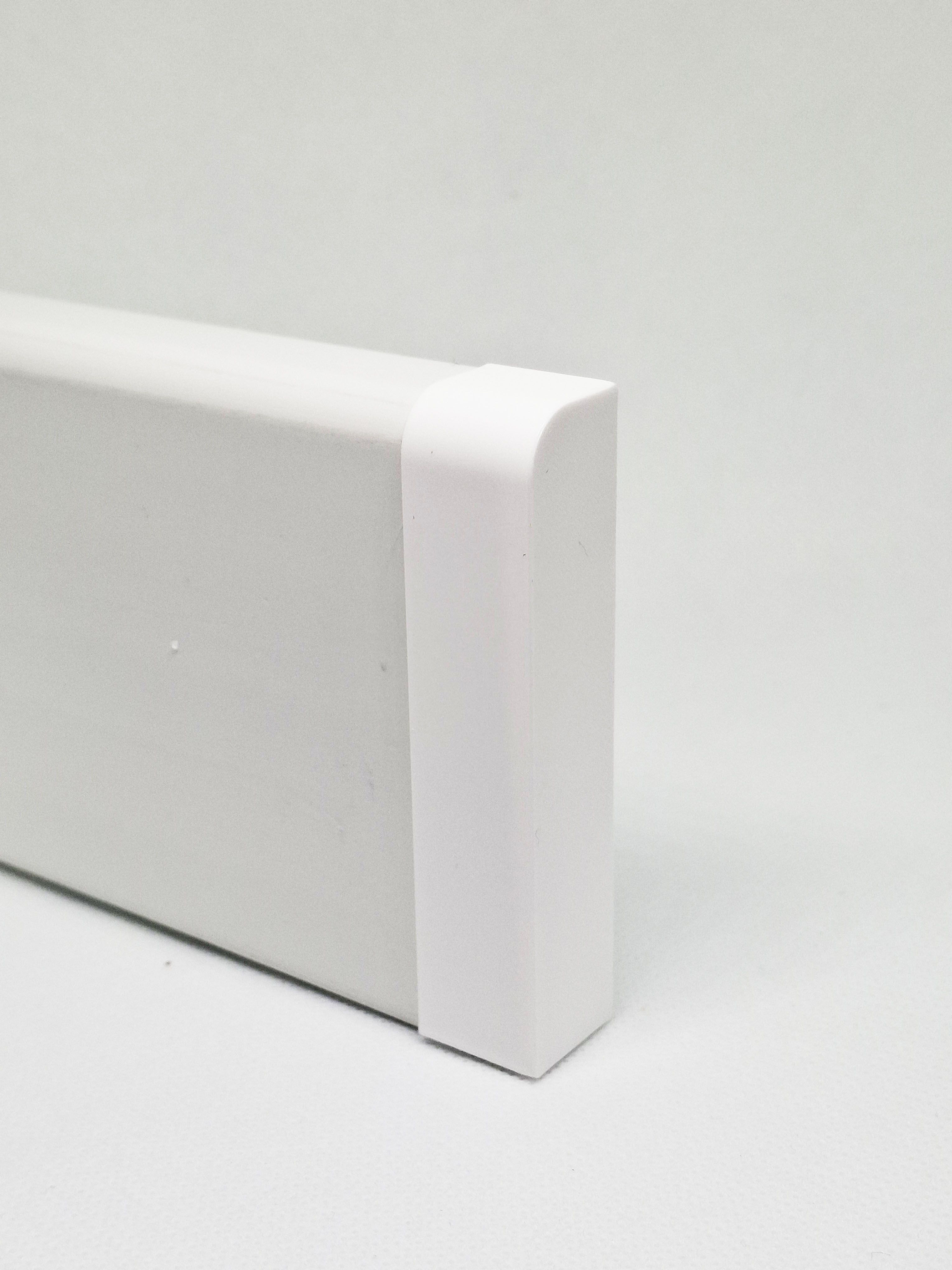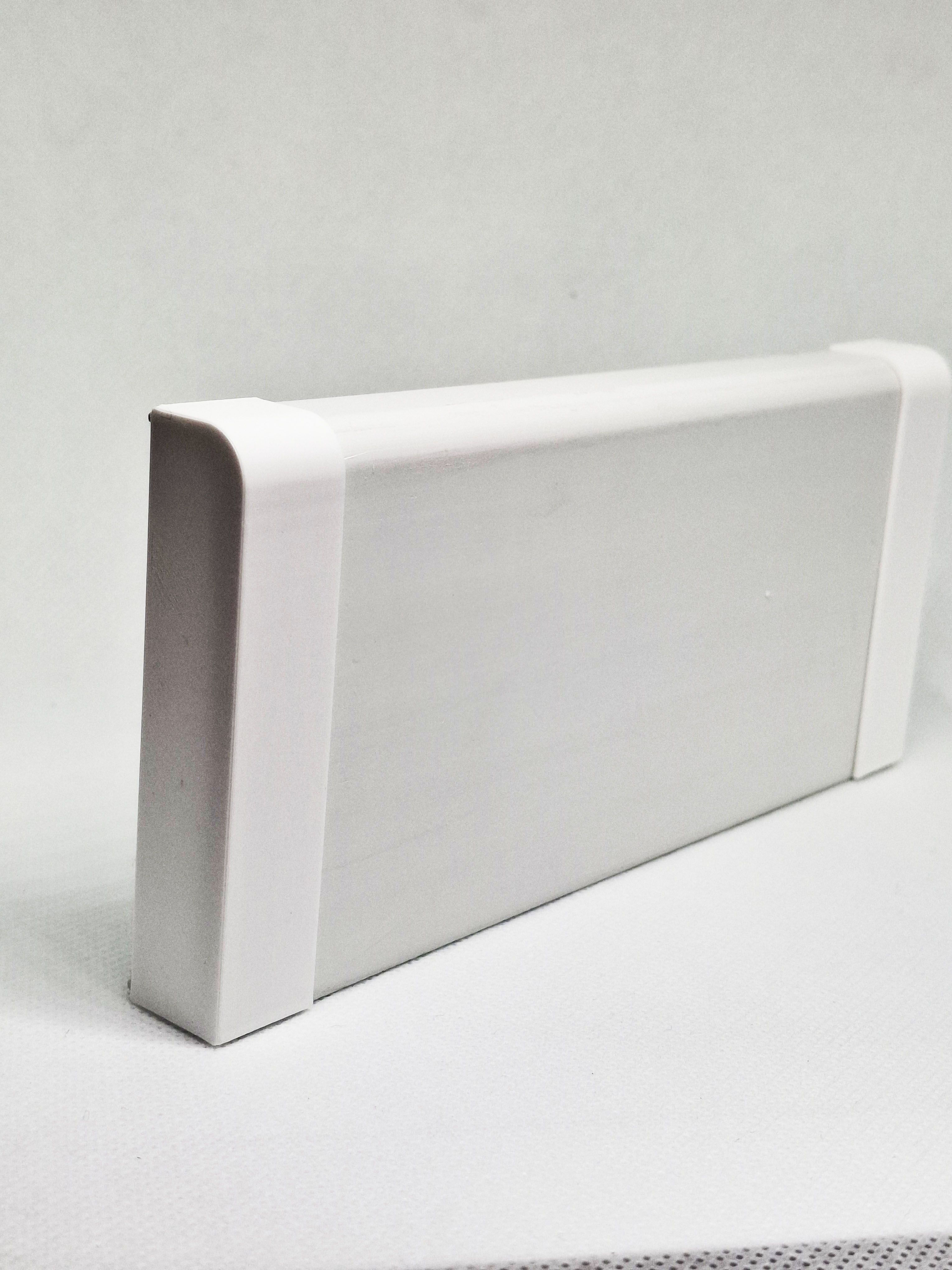 Заглушка сделана из белоснежного пластика, подходит для плинтусов из МДФ, экополимера, полистирола, а так же для плинтусов из любых других материлов имеющий прямоугольный профиль.