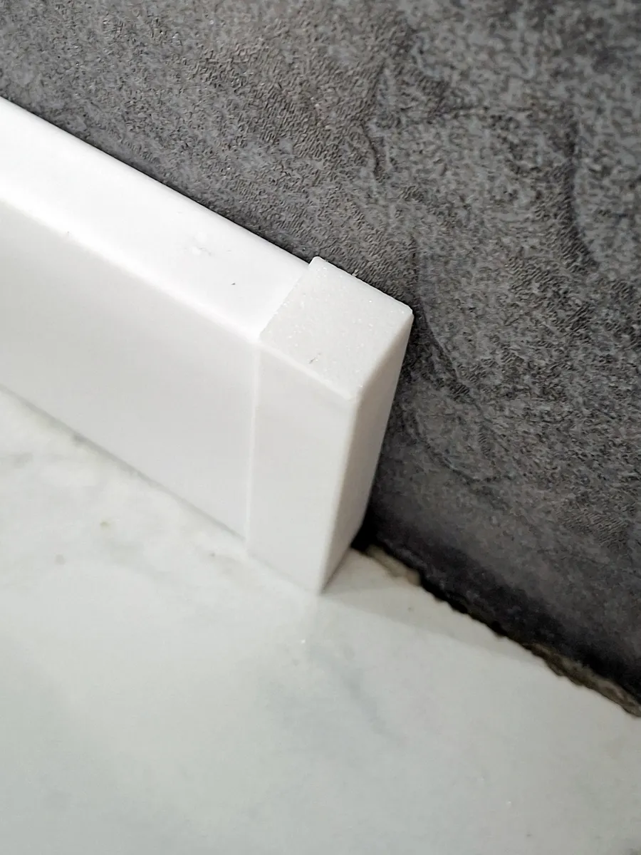 Заглушка сделана из белоснежного пластика, подходит для плинтусов из МДФ, экополимера, полистирола, а так же для плинтусов из любых других материлов имеющий прямоугольный профиль.