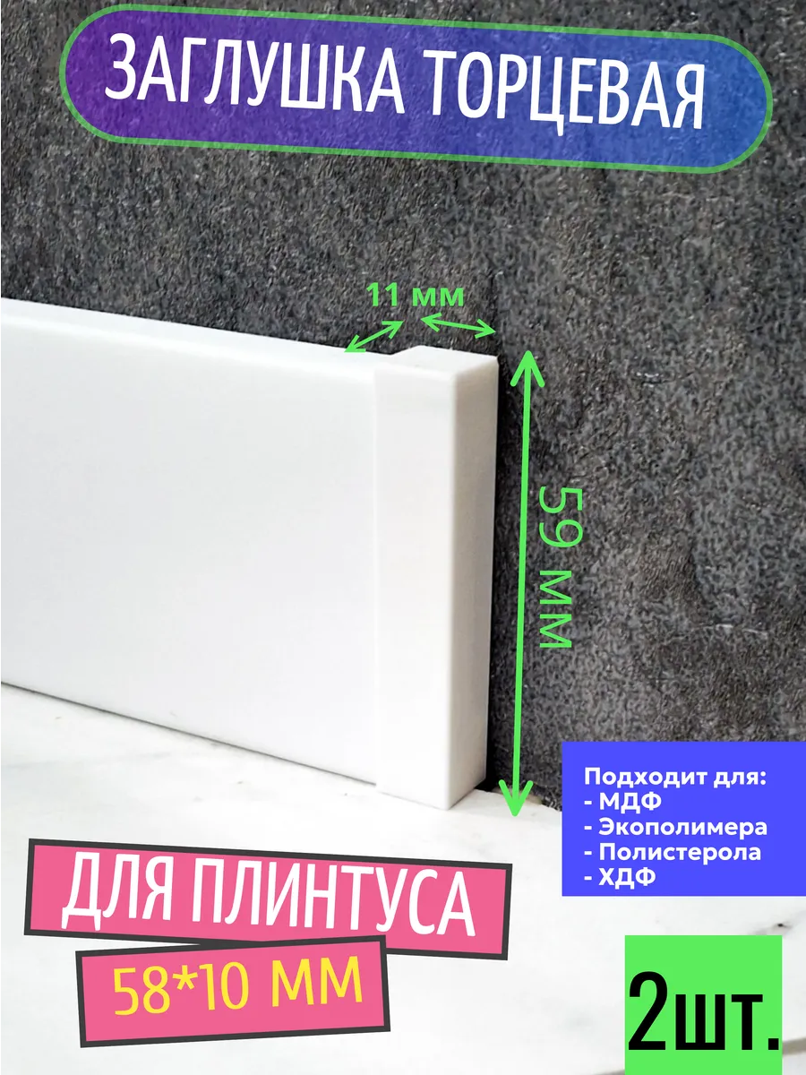 Заглушка отлично подходит для плинтусов из различных материалов, таких как МДФ, экополимер и полистирол, а также для любых других, имеющих прямоугольный профиль. Универсальный дизайн и продуманные размеры (59*11мм) гарантируют идеальную посадку на торец плинтуса с профилем 58*10мм, обеспечивая его защиту и эстетическую завершенность.
